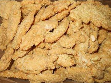 Chicken tenders breaded are solid strips of poultry breast meat ready to fry.