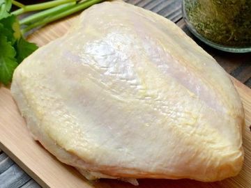 Random size whole chicken breast with bone in and skin on good for all breast applications from grilling, roasting, frying, baking.